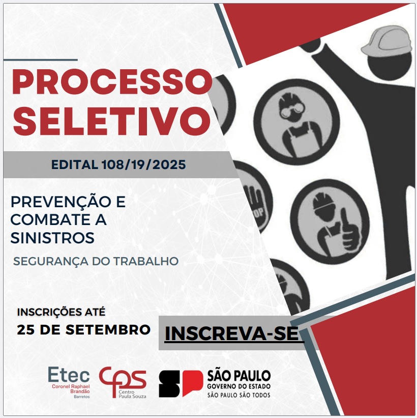 EDITAL DE ABERTURA Nº 108/19/2025 CÓD. DA UNIDADE: 108 – UNIDADE DE ENSINO: Escola Técnica Estadual Coronel Raphael Brandão – CIDADE: Barretos CURSO: SEGURANÇA DO TRABALHO DISCIPLINA: 1499 – PREVENÇÃO E COMBATE A...