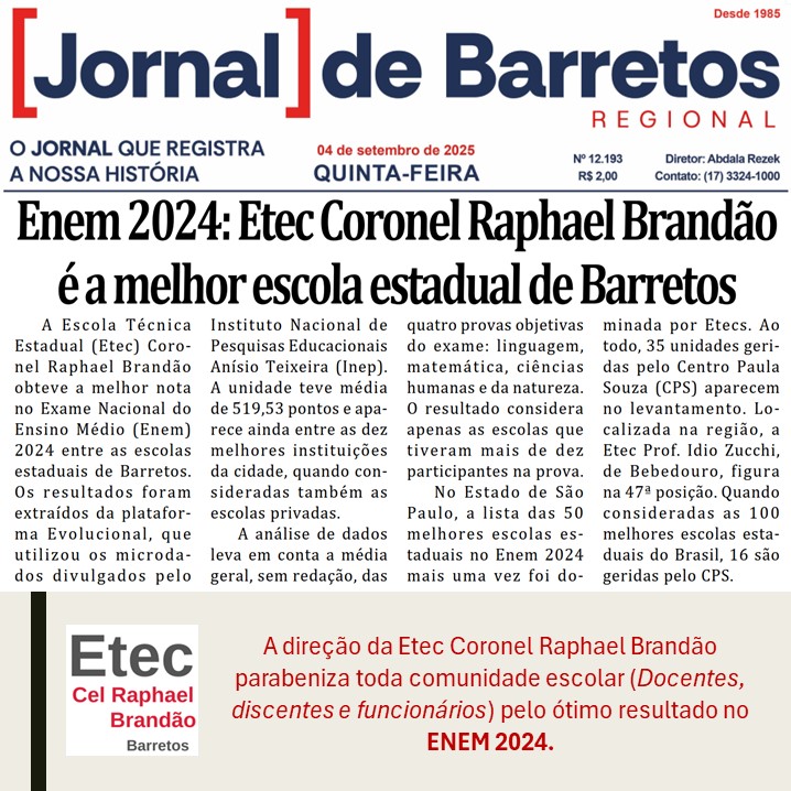 É com grande orgulho que a Etec Coronel Raphael Brandão compartilha com toda a comunidade escolar e regional a conquista de melhor escola estadual de Barretos no Exame Nacional do Ensino Médio – ENEM 2024. Segundo dados divulgados pela plataforma Evolucional, com base nas informações do INEP, a Etec Coronel Raphael Brandão alcançou uma média geral de 519,53 pontos, posicionando-se entre as dez melhores instituições de ensino da cidade, considerando inclusive escolas privadas. Essa conquista é resultado do trabalho sério, comprometido e colaborativo de nossos professores, alunos, gestores e funcionários, que diariamente se dedicam à excelência na educação pública. Além disso, entre as 50 melhores escolas estaduais do Estado de São Paulo no ENEM 2024, mais uma vez a Etec Coronel Raphael Brandão marca presença com destaque. A Direção da unidade parabeniza toda a comunidade escolar pelo excelente desempenho e reforça seu compromisso com uma educação técnica, humana e de qualidade. A Direção da unidade parabeniza toda a comunidade escolar pelo excelente desempenho e reforça seu compromisso com uma educação técnica, humana e de qualidade. Que essa conquista nos inspire a seguir em frente, sempre com foco, determinação e orgulho de sermos ETEC!