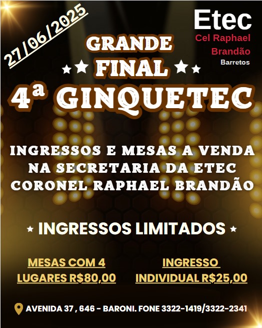 No dia 27 de junho de 2025, a partir das 19h, será realizada na Etec Coronel Raphael Brandão a tão aguardada grande final da 4ª GINQUETEC, a gincana cultural da nossa escola!