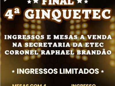 No dia 27 de junho de 2025, a partir das 19h, será realizada na Etec Coronel Raphael Brandão a tão aguardada grande final da 4ª GINQUETEC, a gincana cultural da nossa escola! Este evento especial é voltado para toda a comunidade […]