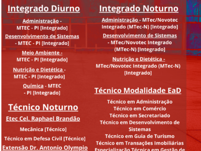 Estão abertas as inscrições para o processo de vagas remanescentes do cursos modulares da Etec Coronel Raphael Brandão.As vagas são para acesso aos cursos Técnicos: Enfermagem; Mecânica, Administração, Serviços Jurídicos, Gastronomia, Segurança do Trabalho e Química.A inscrição […]